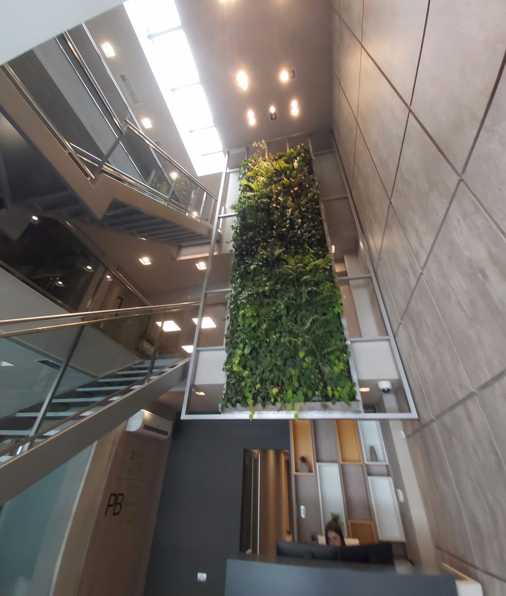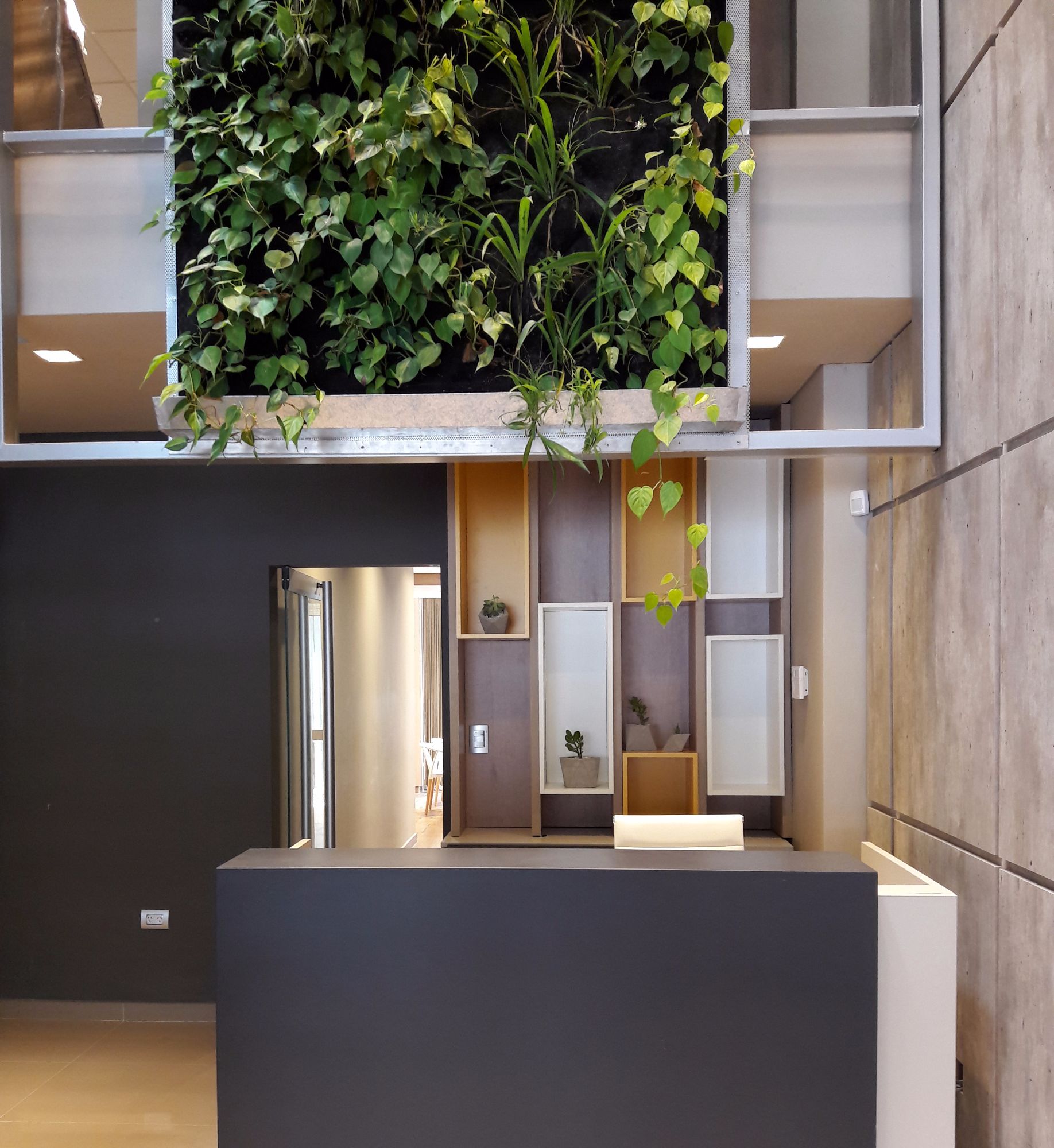 desde el ingreso hasta la planta con visuales directas desde distintos sectores de trabajo. Espacios desinados a las reuniones informales y mucho contacto con lo natural. Un importante jardín vertical genera un eje que atraviesa todos