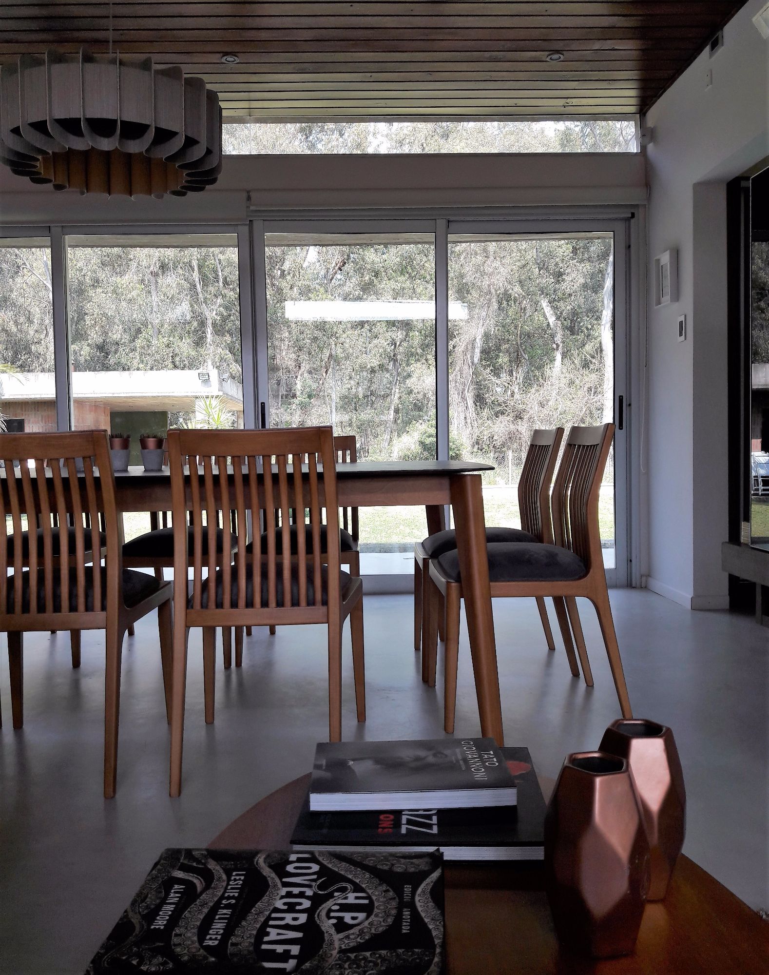 el cielorraso de madera contribuye al mismo efecto. Las melaminas y el vidrio negro con que se construyeron los amoblamientos, léase en esto la cocina, que adquiere gran protagonismo, el mobiliario de tv, e incluso los muebles