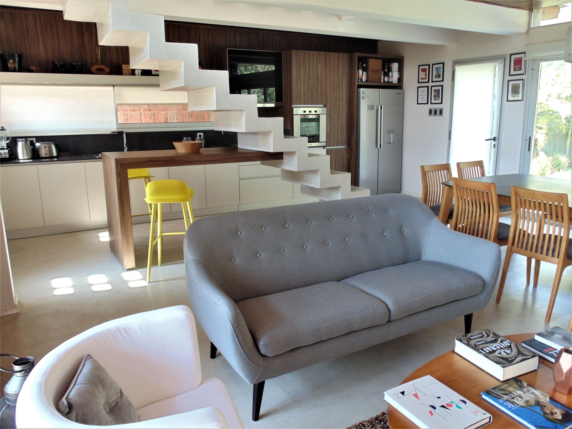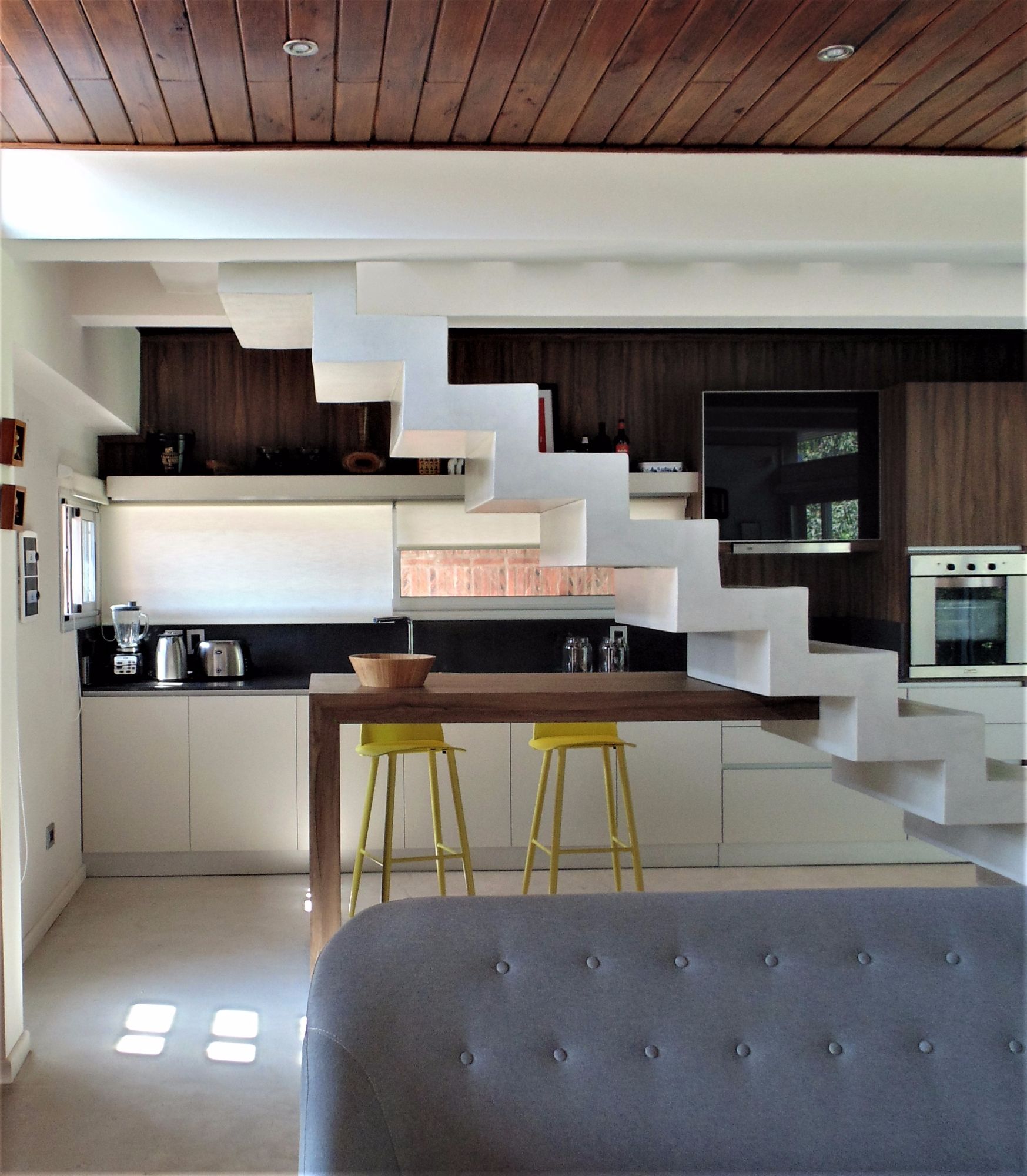 materialidad, la que ayuda a reforzar este concepto, el piso de microcemento alisado en toda la planta baja que se continua en el desarrollo de la escalera refuerza la idea de continuidad espacial, de la misma manera